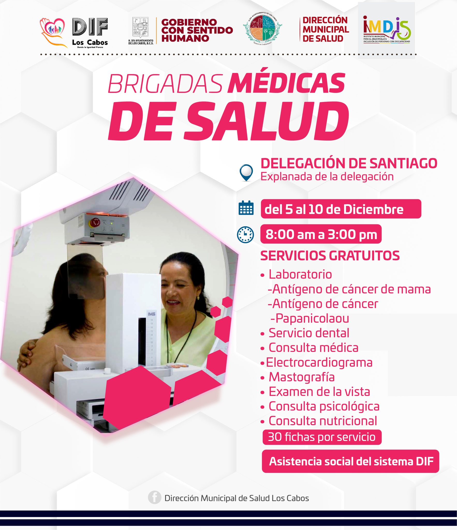 Los Cabos, B.C.S., 05 diciembre 2022.- Con la meta de prevenir y detectar enfermedades, así como acercar los servicios médicos básicos a las familias que más lo necesiten, el Gobierno de Los Cabos que preside Oscar Leggs Castro, a través de la Dirección Municipal de Salud a cargo del Dr. Juan Carlos Costich Pérez, continúa ofreciendo servicios gratuitos mediante las Brigadas Médicas de Salud, mismas que del 05 al 10 de diciembre estarán en la explanada de la Delegación de Santiago; cabe destacar que el horario de atención es de 8:00 de la mañana a 3:00 de la tarde.