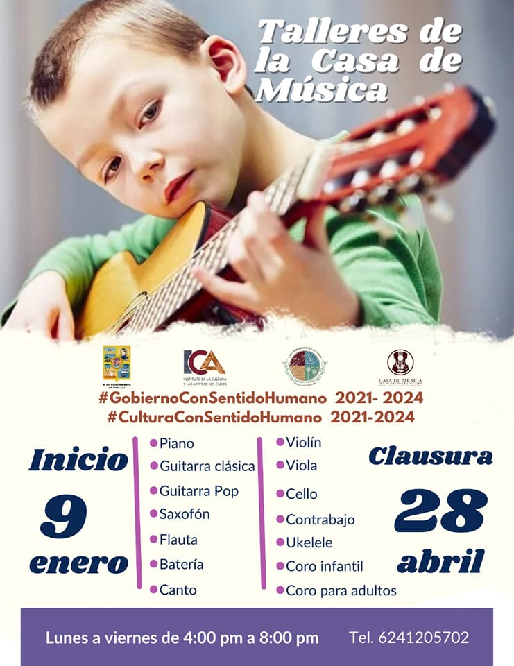 Al respecto, la directora del ICA Los Cabos Irene Román Salgado, informó que la ciudadanía en general tiene acceso a clases de piano, guitarra clásica, guitarra pop, saxofón, flauta, batería, canto, violín, viola, cello, contrabajo, ukelele, coro infantil y coro para adultos en la Casa de Música ubicada en boulevard Barlovento de la colonia Rosarito en San José del Cabo.