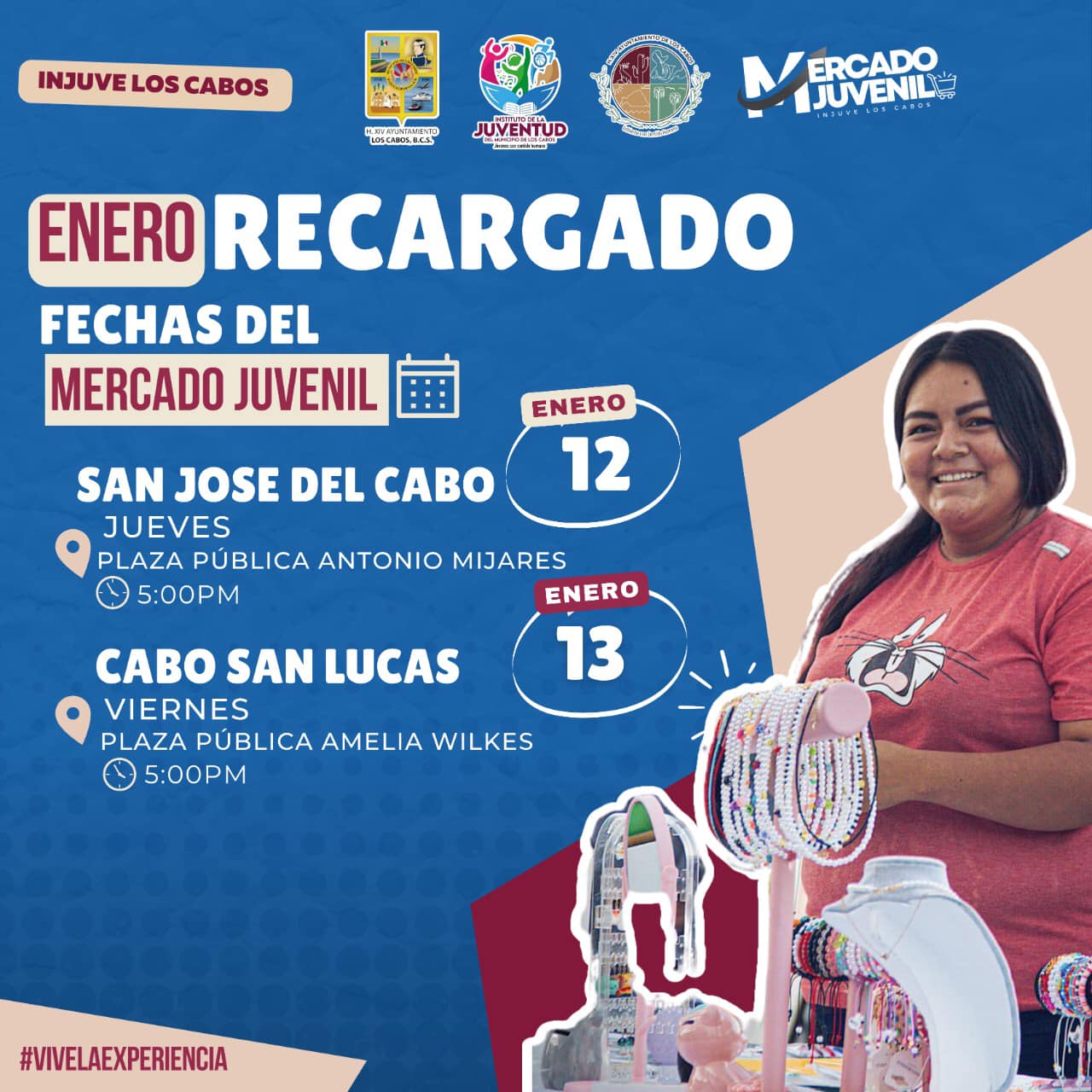 Los Cabos, B.C.S., 12 enero 2023.-El XIV Ayuntamiento de Los Cabos que preside Oscar Leggs Castro, a través del Instituto de la Juventud del Municipio de Los Cabos (INJUVE), a cargo de Eduardo Gamaliel Valdez Ortiz, invita a la ciudadanía a que asistan al “Mercado Juvenil”, que se llevará a cabo este jueves 12 de enero en San José del Cabo en la plaza pública José Antonio Mijares y el viernes 13 en la delegación de Cabo San Lucas en la plaza pública Amelia Wilkes, a partir de las 5:00 de la tarde.