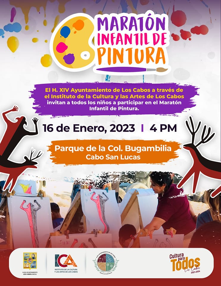 Los Cabos, B.C.S., 15 enero 2023.- El XIV Ayuntamiento de Los Cabos a través del Instituto de la Cultura y las Artes de Los Cabos (ICA), a cargo de Irene Román Salgado, invita a niñas y niños a participar en el “Maratón Infantil de Pintura”, que se llevará a cabo el próximo lunes 16 de enero a las 4:00 de la tarde en la delegación de Cabo San Lucas en el parque público de la colonia Bugambilia.