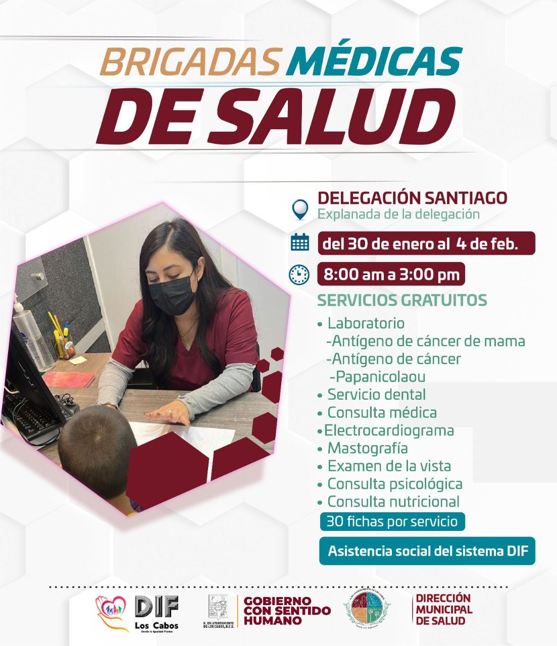 Los Cabos, B.C.S., 29 enero 2023.-El XIV Ayuntamiento de Los Cabos que preside Oscar Leggs Castro, a través de la Dirección Municipal de Salud, a cargo del Dr. Juan Carlos Costich Pérez, invita a la población de la delegación de Santiago a que hagan uso de las “Brigadas Médicas de Salud “que estarán del 30 de enero al 4 de febrero en la explanada de la Delegación, en un horario de atención de 8:00 de la mañana a 3:00 de la tarde.
