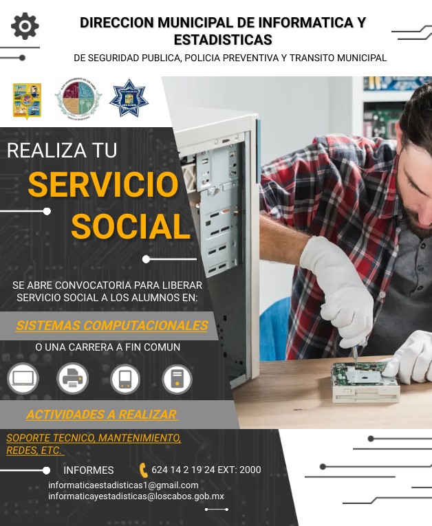 Los Cabos, B.C.S., 08 marzo 2023.- El Gobierno de Los Cabos que preside Oscar Leggs Castro, a través de la Dirección General de Seguridad Pública, Policía Preventiva y Tránsito Municipal de Los Cabos (DGSPPPTM) invita estudiantes de la carrera de Sistemas Computacionales a realizar su servicio social en la Dirección Municipal de Informática y Estadística de la corporación policial.