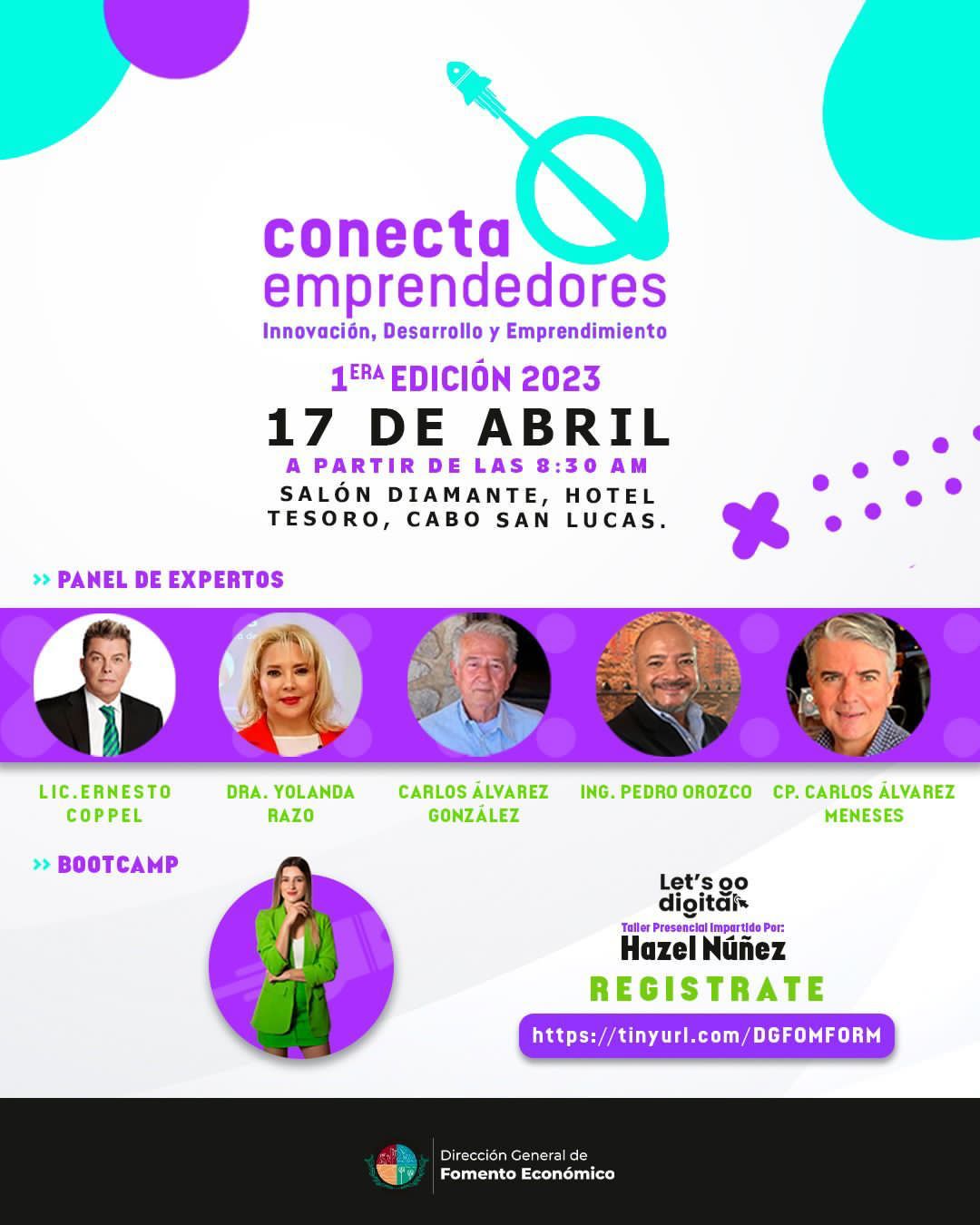 Los Cabos, B.C.S., 15 abril 2023.- En el marco del Día Mundial del Emprendimiento, el Gobierno de Los Cabos a través de la Dirección General de Fomento Económico, realizará el evento denominado “Conecta Emprendedores” en su 1° edición 2023, cuyo objetivo es promover y despertar el espíritu innovador en la creación de negocios; dicha actividad se hará el próximo lunes 17 de abril en el salón Diamante del Hotel El Tesoro que se localiza en Cabo San Lucas, a partir de las 08:30 de la mañana, mismo que tendrá acceso libre para la comunidad en general.