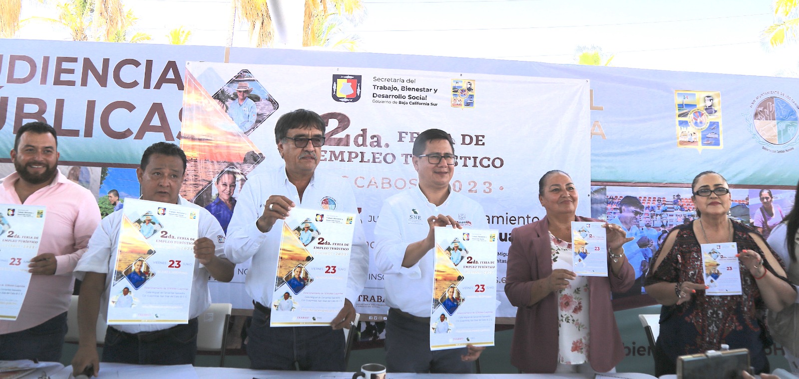 Los Cabos, B.C.S, 20 junio 2023.- Este miércoles 21 de junio el alcalde de Los Cabos Oscar Leggs Castro tuvo a bien presidir el anuncio de la 2da Feria de Empleo Turístico que se desarrollará este viernes 23 de junio en San José del Cabo, acto que contó con la presencia del titular del Servicio Nacional de Empleo (SNE) en Baja California Sur, Vladirmir Torres Navarro y el coordinador regional del Servicio Nacional de Empleo de Baja California Sur en Los Cabos, Alberto Telles Sahuque, así como personas servidoras públicas de la XIV Administración Municipal.