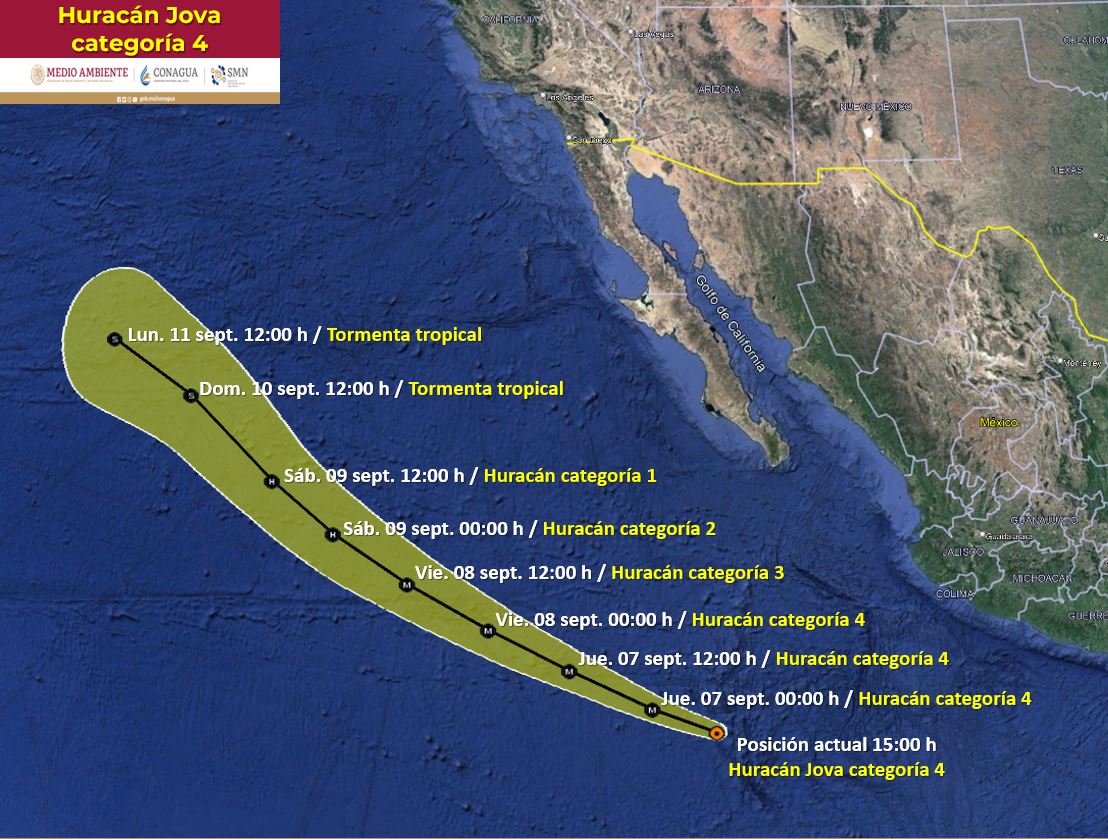 El Consejo Estatal de Protección Civil, mantiene monitoreo permanente de la trayectoria y evolución del huracán categoría 4 “Jova”, el cual, hasta este momento, no representa un riesgo para costas mexicanas ni para Baja California Sur; sin embargo, el desprendimiento de algunas nubes podría estar generando algunas lluvias sobre el territorio sudcaliforniano, dio a conocer el subsecretario de Protección Civil en la entidad, Benjamín García Meza.