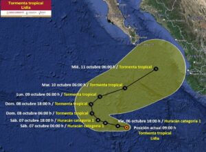 ‘’La tormenta tropical ‘’Lidia’’ ha estado errática en la trayectoria y existe la posibilidad de un encorvamiento hacia la parte de sur de la península de Baja California Sur, y por su circulación y acercamiento generará desprendimiento de nubes por lo que este sábado seguirá lloviendo y para el domingo ‘’Lidia’’ ya convertido como huracán categoría 1 originará lluvias y oleaje elevado; quiero informar que hay un pronóstico extendido y el lunes se esperan precipitaciones fuertes de 25 milímetros acompañadas de rachas de vientos’’, indicó el subdirector de Protección Civil Francisco Cota.