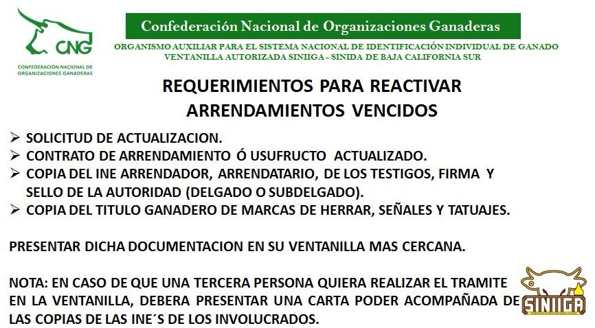 Para dicho trámite, las personas interesadas deben llevar los siguientes requisitos: solicitud de actualización, contrato de arrendamiento o usufructo actualizado, copia del INE del arrendador, arrendatario y de los testigos, firma y sello de la autoridad delegado o subdelegado, y copia del título ganadero de marcas de herrar señales y tatuajes.
