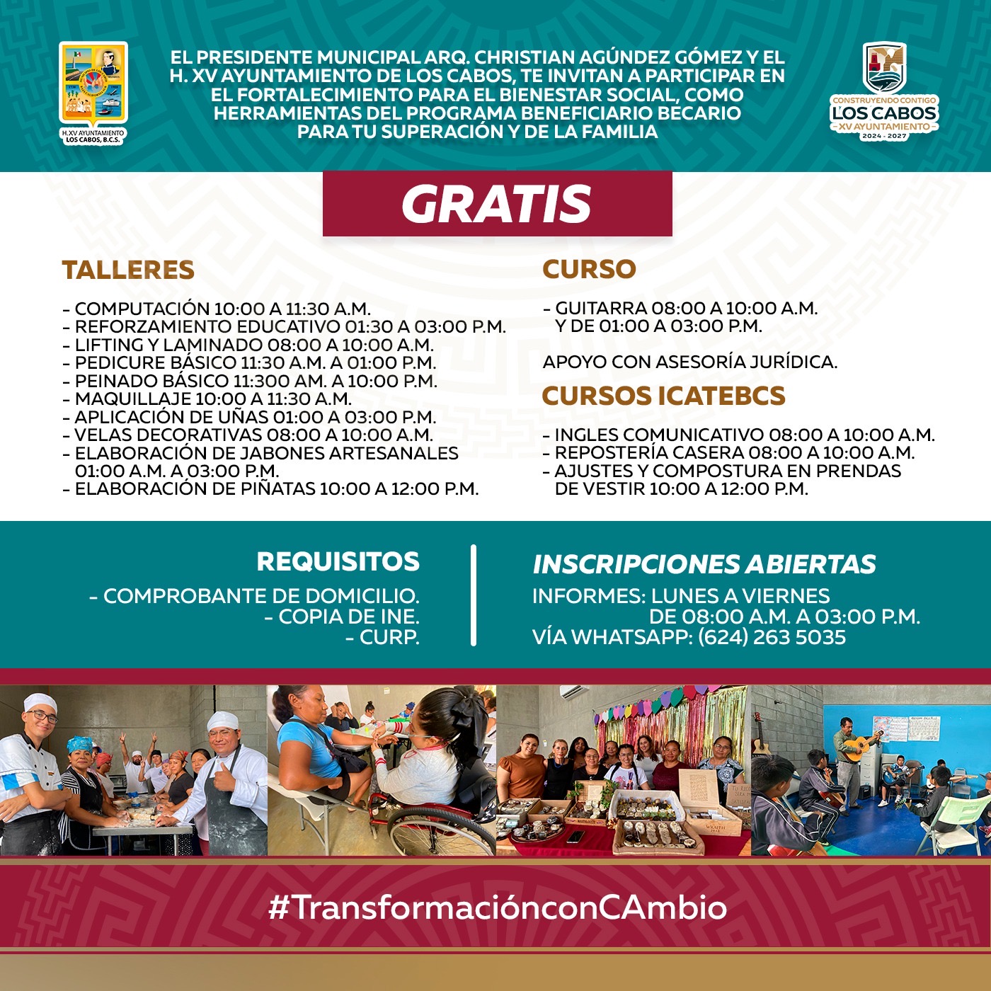 El XV Ayuntamiento de Los Cabos, informa que las inscripciones están abiertas para participar en talleres y cursos gratuitos; los requisitos son copias de comprobante de domicilio, INE y CURP. Para mayores informes, comunícate de lunes a viernes, de 8:00 de la mañana a 3:00 de la tarde, vía WhatsApp al (624) 263 5035.