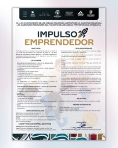 Los Cabos, Baja California Sur.El XV Ayuntamiento de Los Cabos que preside Christian Agúndez Gómez, a través del Instituto de la Juventud (INJUVE), anunció este martes 10 de octubre el arranque del programa “Impulso Emprendedor”, cuya finalidad es ofrecer a jóvenes de 18 a 29 años apoyos de financiamiento para el desarrollo e innovación de micros, pequeñas y medianas empresas.