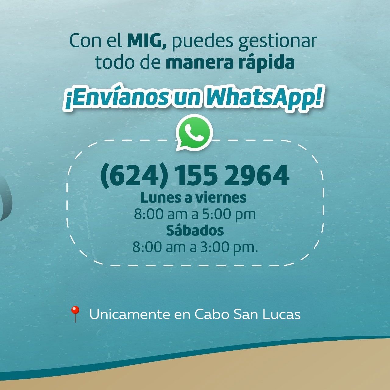 Teléfonos para reportes de fugas: (624) 163 7700 ext. 6721 y 6722; (624) 146 3610. WhatsApp exclusivo para MIG: (624) 155 2964, en horario de atención MIG: Lunes a viernes: 8:00 a.m. a 5:00 p.m. y Sábados: 8:00 a.m. a 3:00 p.m; atención disponible únicamente en Cabo San Lucas.