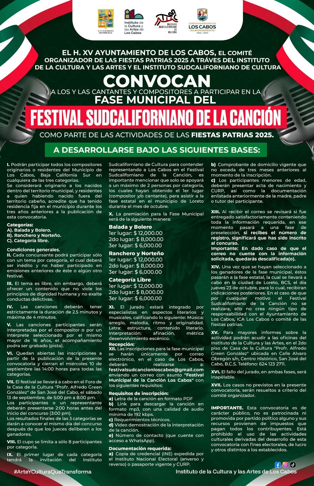 El XV Ayuntamiento de Los Cabos, a través del Instituto de la Cultura y las Artes (ICA), invita a compositoras y compositores originarios o residentes del municipio a participar en el Festival Sudcaliforniano de la Canción 2025, en su fase municipal.