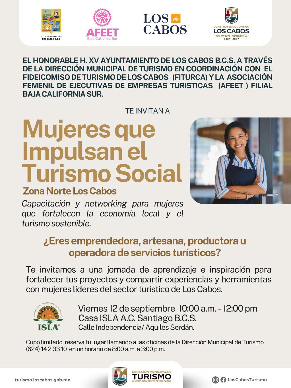 Los Cabos, Baja California Sur.– El XV Ayuntamiento de Los Cabos, a través de la Dirección Municipal de Turismo en coordinación con el Fideicomiso de Turismo de Los Cabos (Fiturca) y la Asociación Femenil de Ejecutivas de Empresas Turísticas (AFEET) Baja California Sur, convoca a mujeres emprendedoras, artesanas, productoras y operadoras de servicios turísticos de la zona norte del municipio a participar en la jornada “Mujeres que impulsan el turismo social”.
