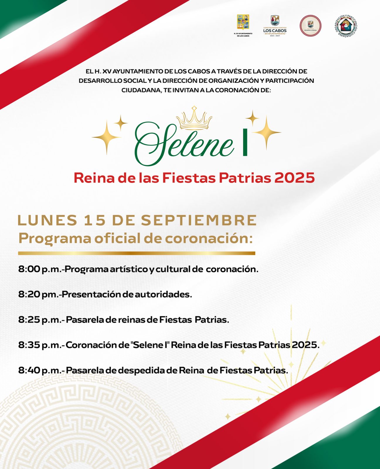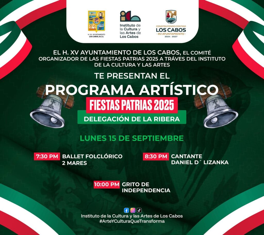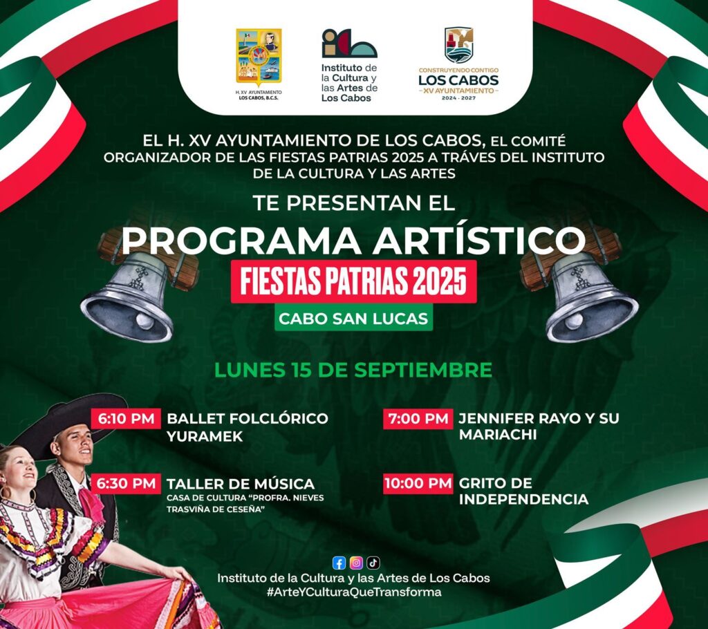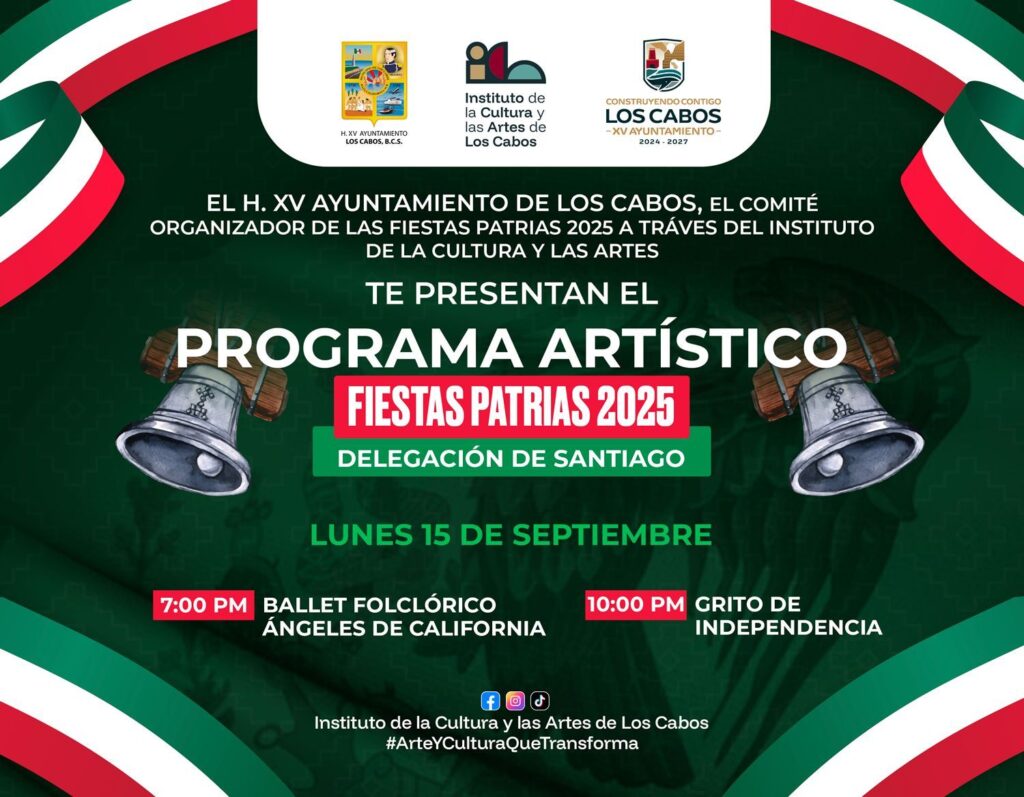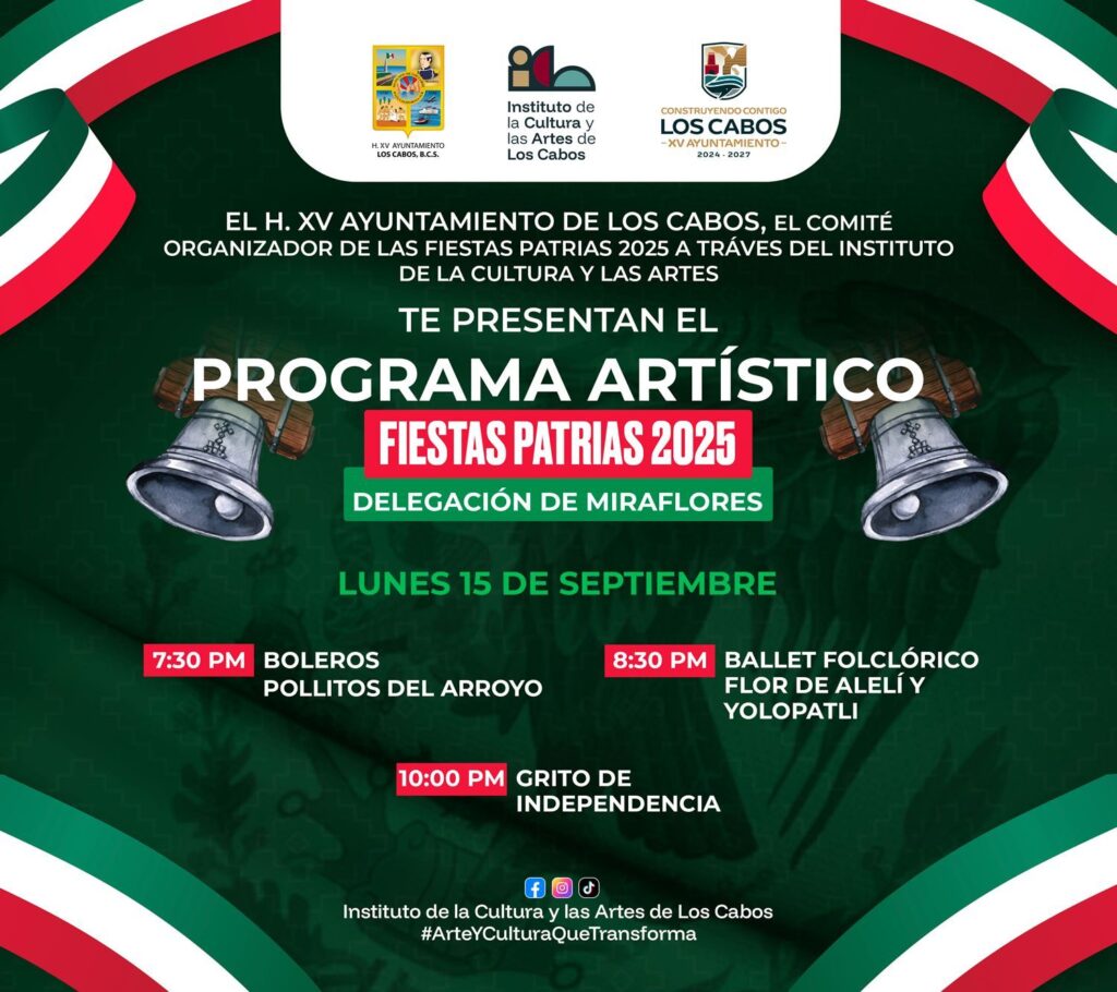 Los Cabos, Baja California Sur.- El XV Ayuntamiento de Los Cabos invita a toda la ciudadanía a disfrutar de los festejos con motivo de las Fiestas Patrias 2025, que se llevarán a cabo este lunes 15 de septiembre en la cabecera municipal y en las diferentes delegaciones.