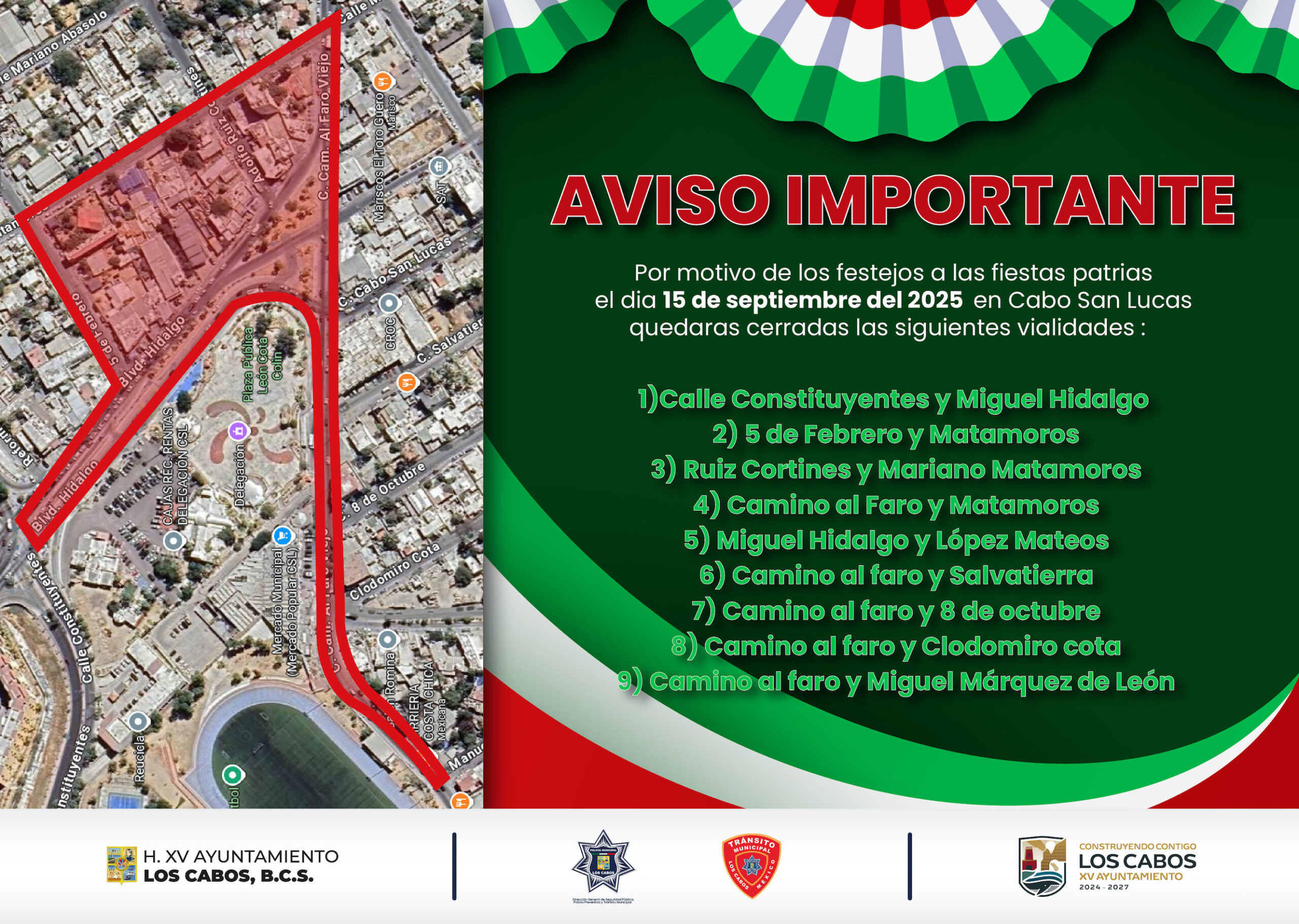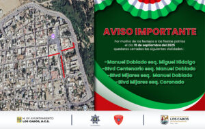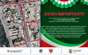 La Dirección General de Seguridad Pública, Policía Preventiva y Tránsito Municipal, comunica a la población en general que debido a la celebración de las Fiestas Patrias 2025, se realizará el cierre de vialidades en diferentes puntos de San José del Cabo y Cabo San Lucas. Desde el día 15 de septiembre del 2025 a partir de las 17:00 horas habrá cortes y desvíos de circulación vehicular sobre las calles aledañas al lugar del evento, esto para brindar seguridad a las personas asistentes y agilizar el tráfico vehicular; de igual manera durante el Desfile Cívico Militar el 16 de septiembre del 2025.