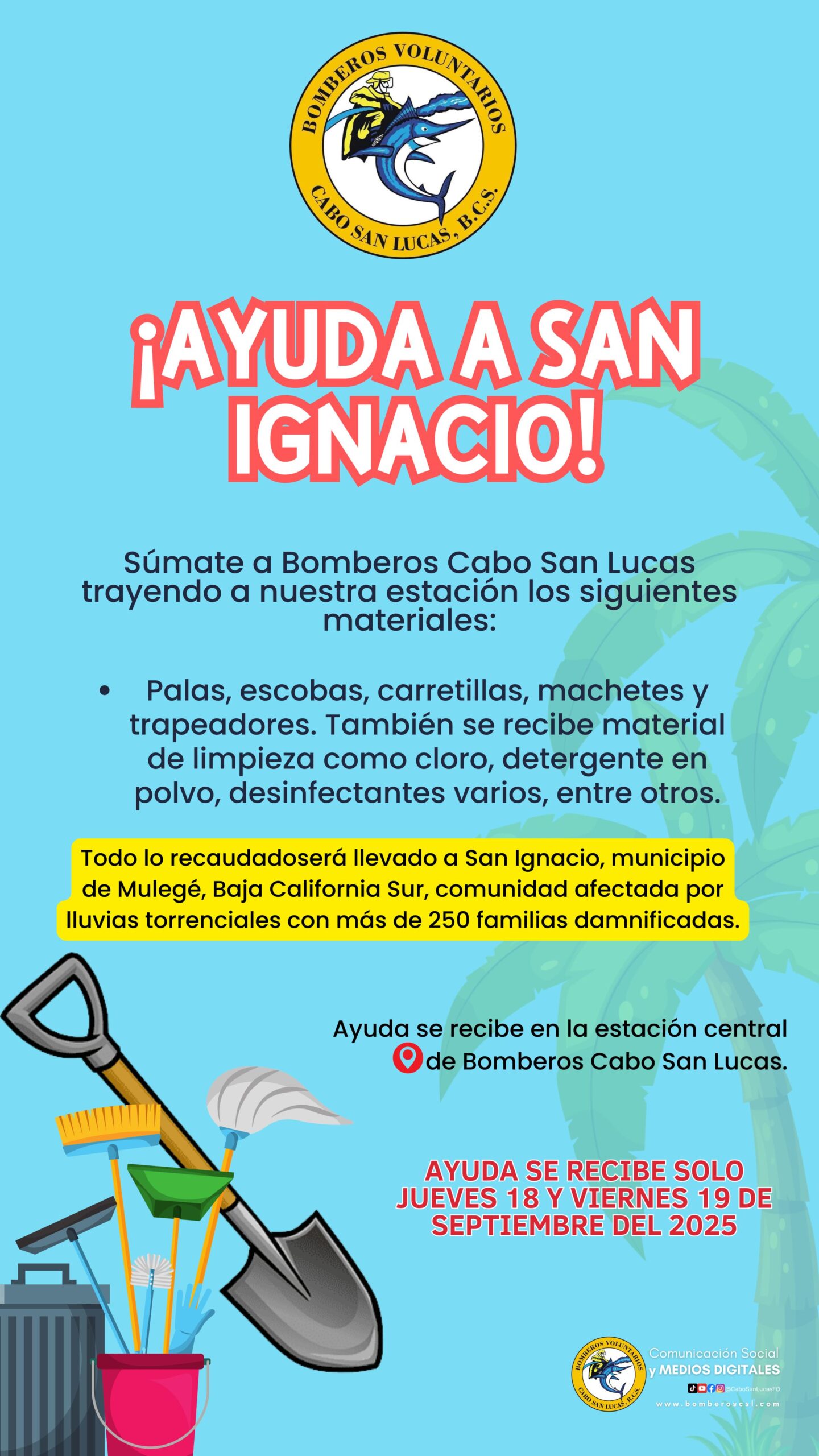 Los apoyos se entreguen este jueves y a más tardar el viernes 19 de septiembre en la estación central del Cuerpo de Bomberos de Cabo San Lucas. La institución agradece de antemano la solidaridad de la comunidad con las familias de San Ignacio, destacando que en momentos de adversidad la unión ciudadana es fundamental para salir adelante.