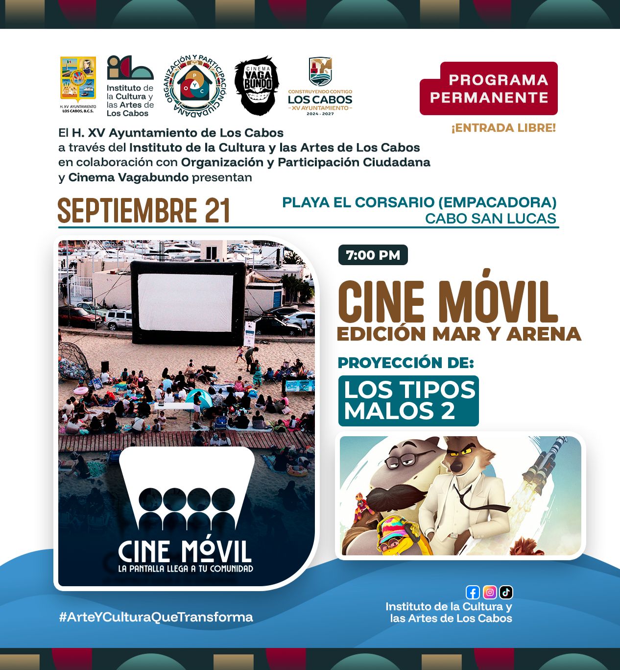 Asimismo, se invita a la ciudadanía a no perderse esta oportunidad de disfrutar un domingo en familia, rodeados de buena compañía y excelente cine. Para mayor información, el Instituto de la Cultura y las Artes de Los Cabos pone a disposición sus redes sociales oficiales.