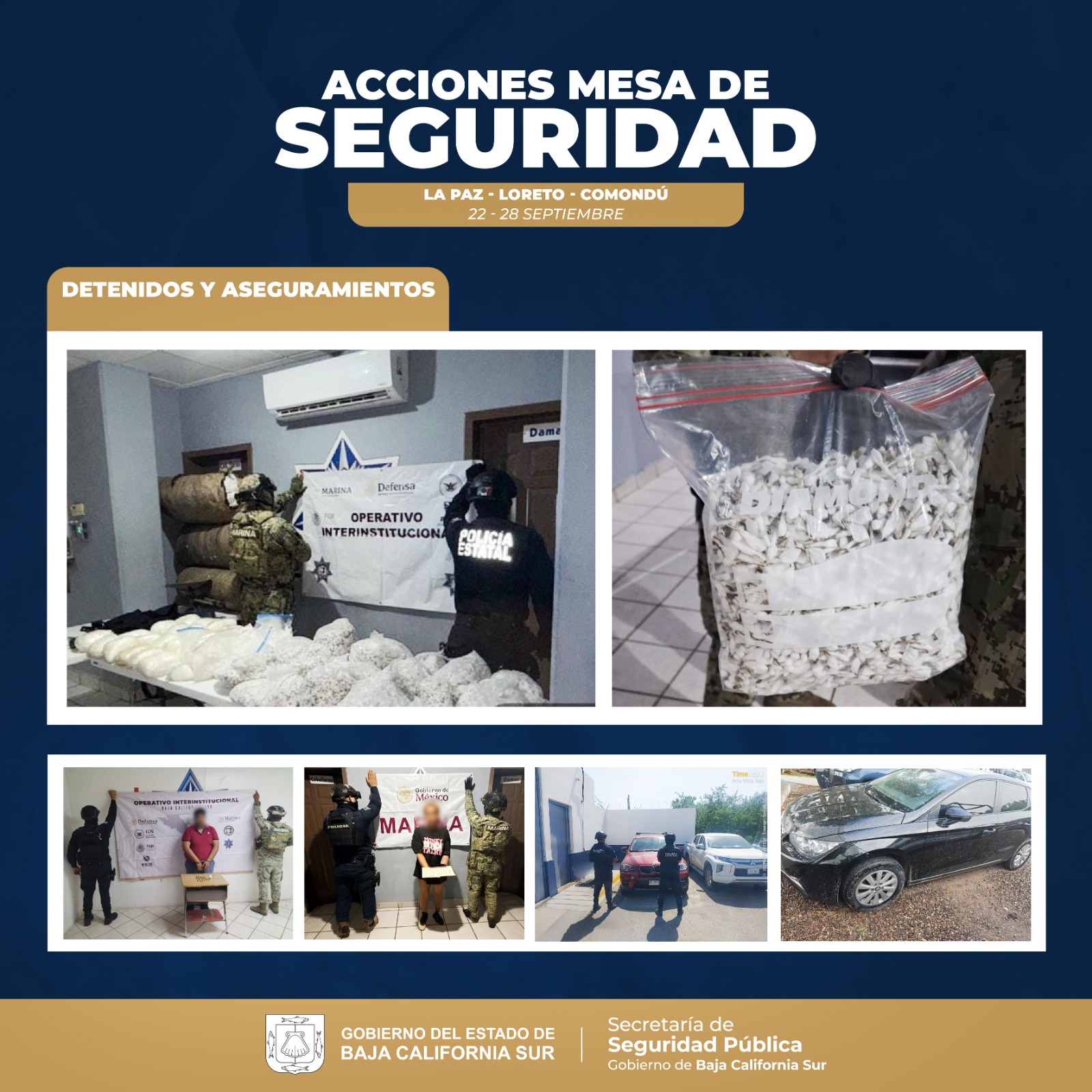Posteriormente en Loreto, en distintas acciones fueron detenidas 02 personas y se aseguraron 03 costales conteniendo al parecer marihuana, con un peso aproximado de 60 kilogramos, 28 kilogramos y 170 mil dosis de droga conocida como cristal, 02 armas de fuego tipo revolver, 01 chaleco táctico, 01 báscula, 01 vehículo y 01 motocicleta.
