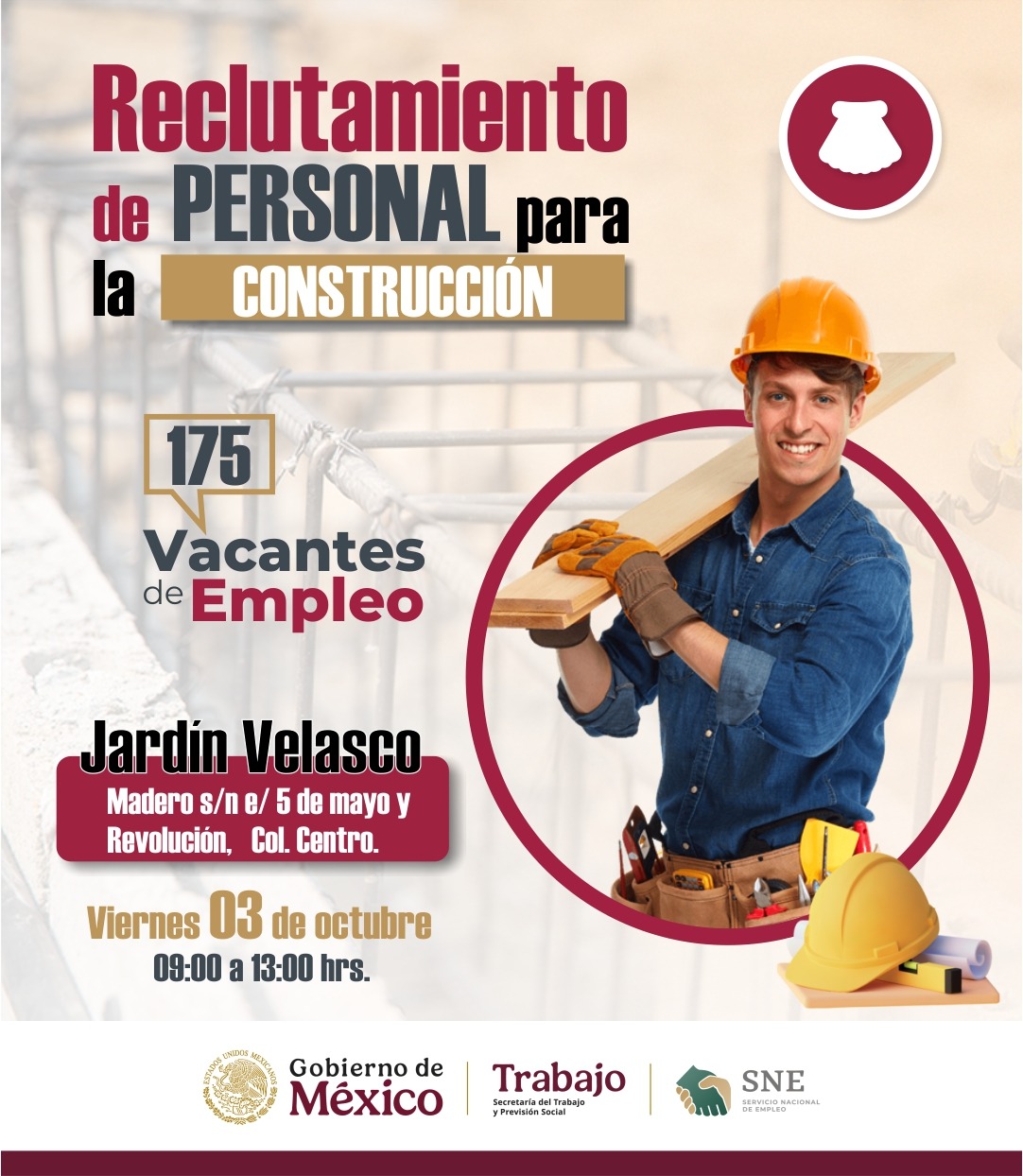 La Secretaría del Trabajo, Bienestar y Desarrollo Social (STByDS), a través del Servicio Nacional de Empleo de Baja California Sur (SNE-BCS), invita a personas con experiencia y conocimientos en el ramo de la construcción a participar en el reclutamiento que se llevará a cabo este viernes tres de octubre, en el Jardín Velasco, ubicado en la calle Francisco I. Madero entre Independencia y 5 de mayo, Colonia Centro, en horario de 9:00 a 13:00 horas.