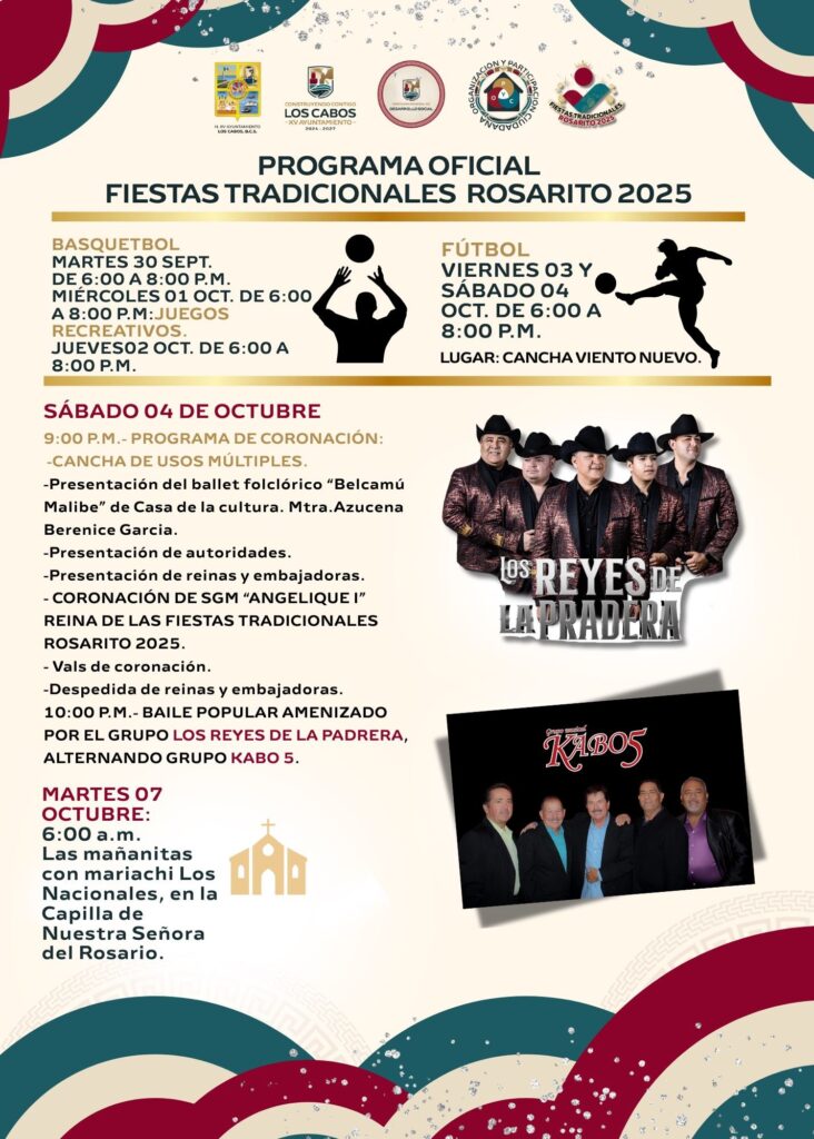 Los Cabos, Baja California Sur.- Del 04 al 07 de octubre se llevarán a cabo las Fiestas Tradicionales Rosarito 2025, con un programa que integra actividades deportivas, culturales y artísticas para todas las edades, consolidándose como uno de los eventos de mayor arraigo en la comunidad.