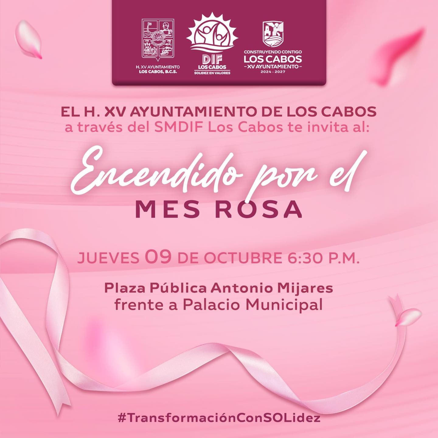 El Ayuntamiento de Los Cabos, encabezado por el alcalde Christian Agúndez Gómez, invita a toda la ciudadanía a asistir al encendido y sumarse a las actividades del Mes Rosa, reafirmando su compromiso con la salud, la prevención y el bienestar integral de las y los cabeños.