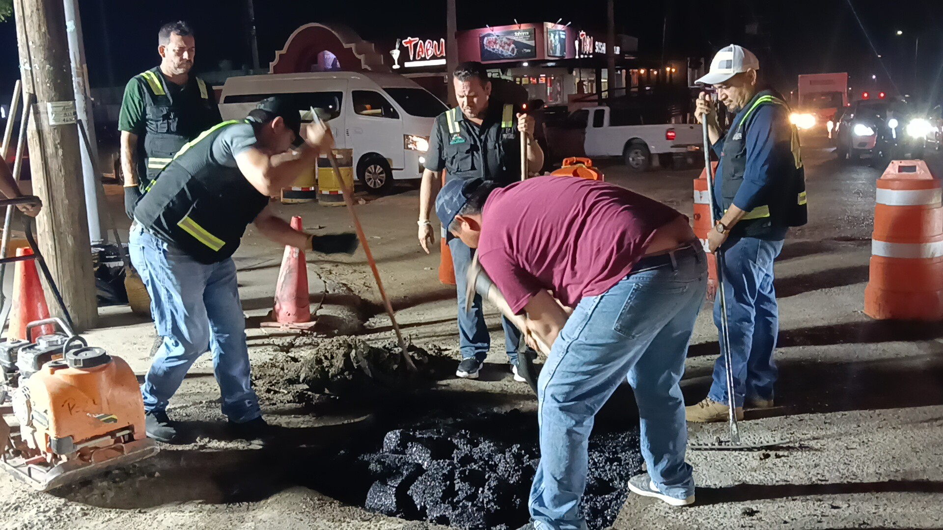 Los Cabos, Baja California Sur.– El XV Ayuntamiento de Los Cabos, a través de la Dirección General de Obras Públicas y Asentamientos Humanos, realiza trabajos de bacheo esta noche en la Delegación de Cabo San Lucas, con labores que forman parte del programa de mantenimiento vial “Caza Baches”, que tiene como objetivo mejorar las condiciones de circulación en las zonas más afectadas.