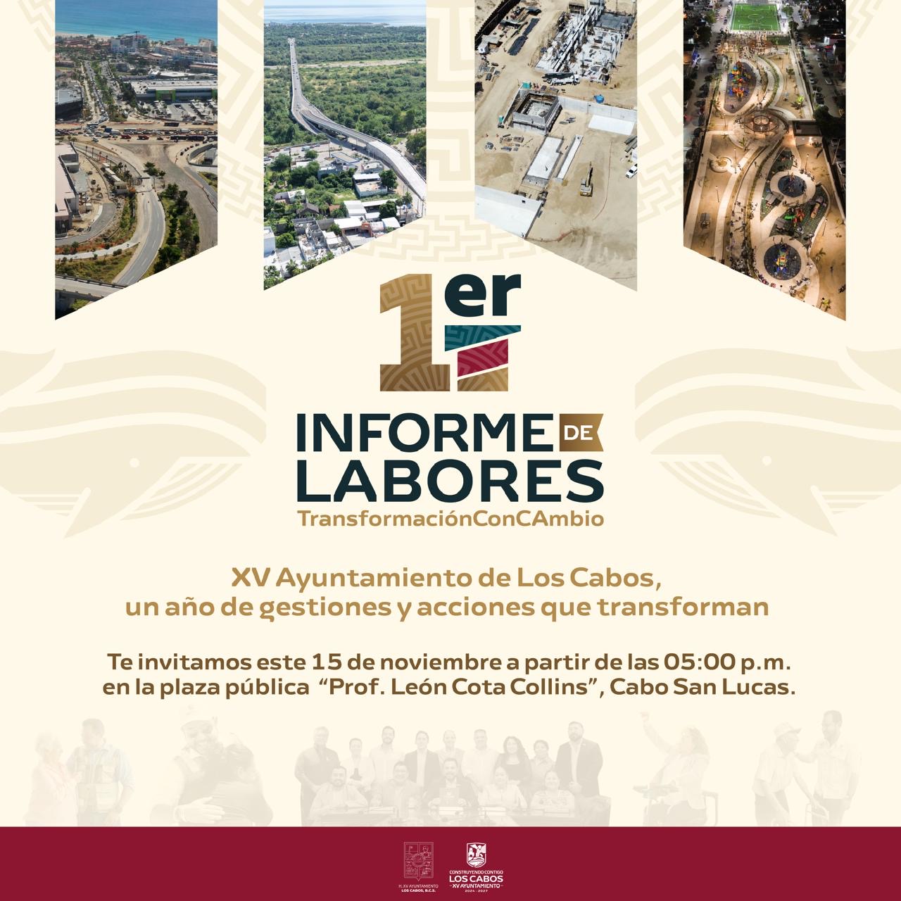 La XV administración municipal de Los Cabos te invita al Primer Informe de Gobierno del Arq. Christian Agúndez Gómez, a realizarse el próximo sábado 15 de noviembre a las 5:00 pm, desde la plaza pública “Profr. León Cota Collins” de la delegación de Cabo San Lucas