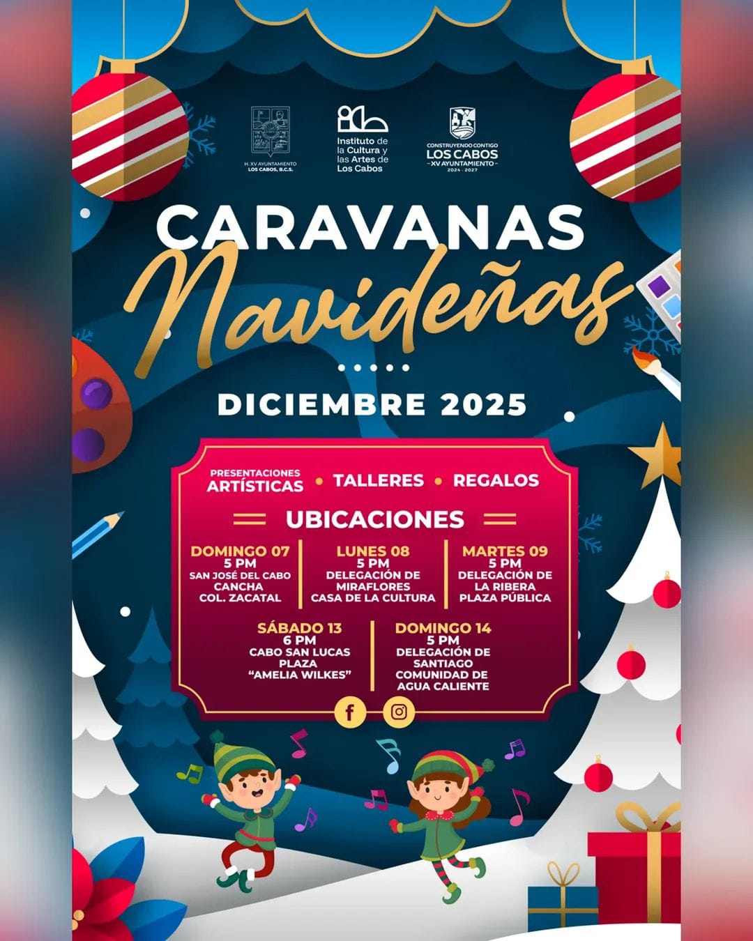 Los Cabos, Baja California Sur.- El XV Ayuntamiento de Los Cabos, a través del Instituto de la Cultura y las Artes (ICA) anunció que como parte de los festejos decembrinos y con el propósito de fortalecer la convivencia familiar, se llevarán a cabo las Caravanas Navideñas 2025 en las cuatro delegaciones y la cabecera municipal.