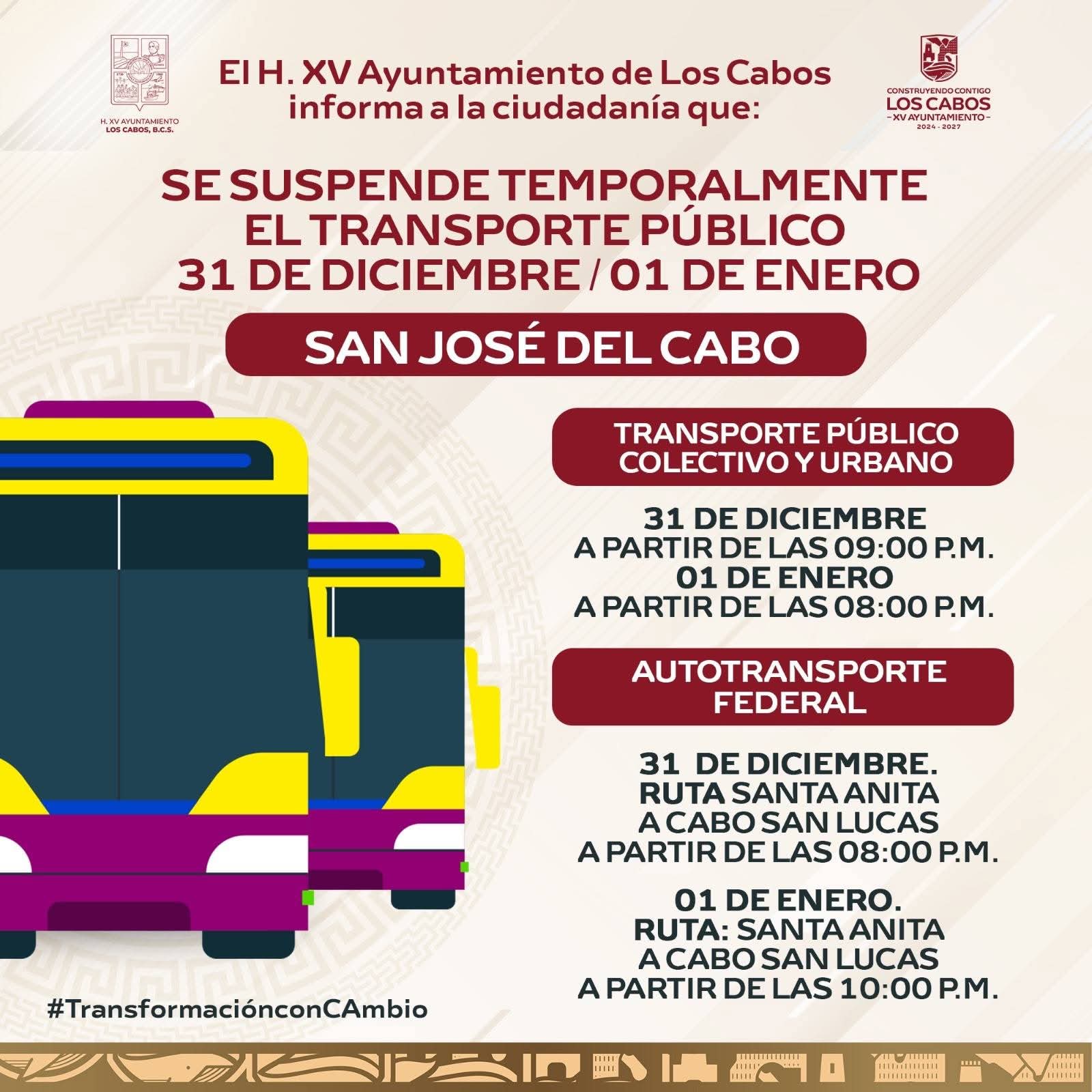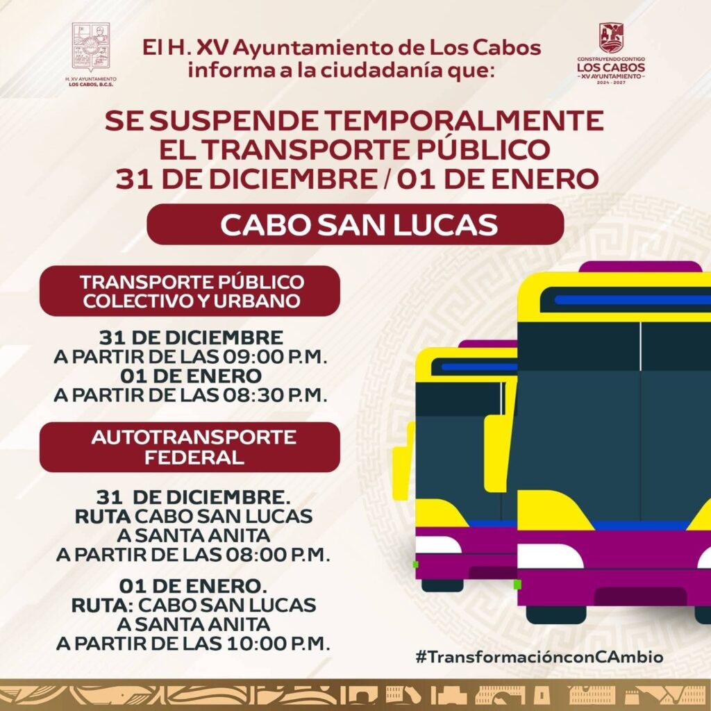 El XV Ayuntamiento de Los Cabos a través de la Dirección Muncipal de Transporte, informa a la ciudadanía que, con motivo de las celebraciones de Año Nuevo y como medida preventiva para garantizar una movilidad ordenada y segura, se implementarán la suspensión temporal del servicio del transporte público colectivo, urbano y del autotransporte federal, durante el 31 de diciembre y el 01 de enero.