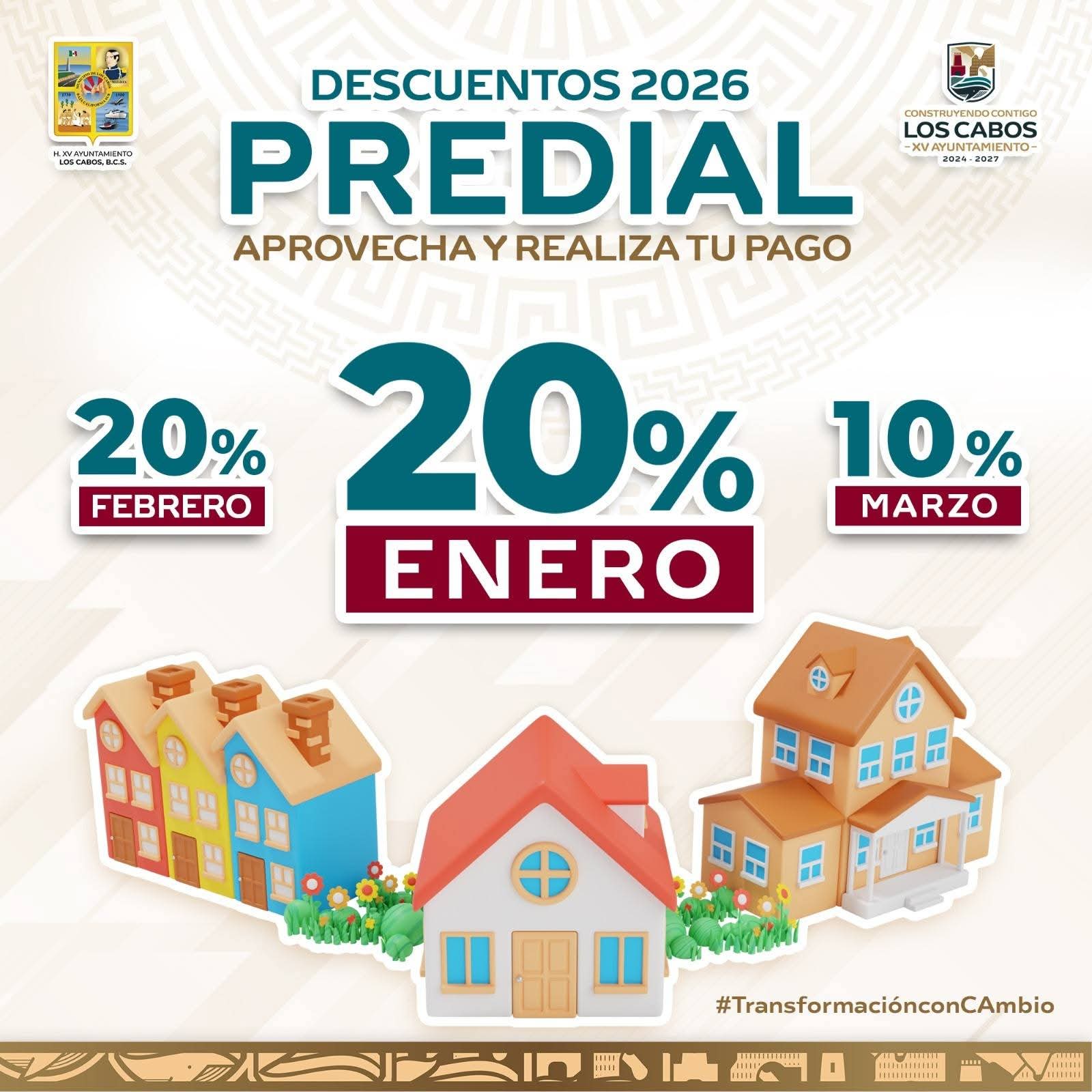 Con el objetivo de fomentar el cumplimiento oportuno de las contribuciones municipales y fortalecer las finanzas públicas, el XV Ayuntamiento de Los Cabos, que encabeza el alcalde Christian Agúndez Gómez, informa que a partir del 01 de enero de 2026 estarán vigentes los descuentos autorizados para el pago del impuesto predial.