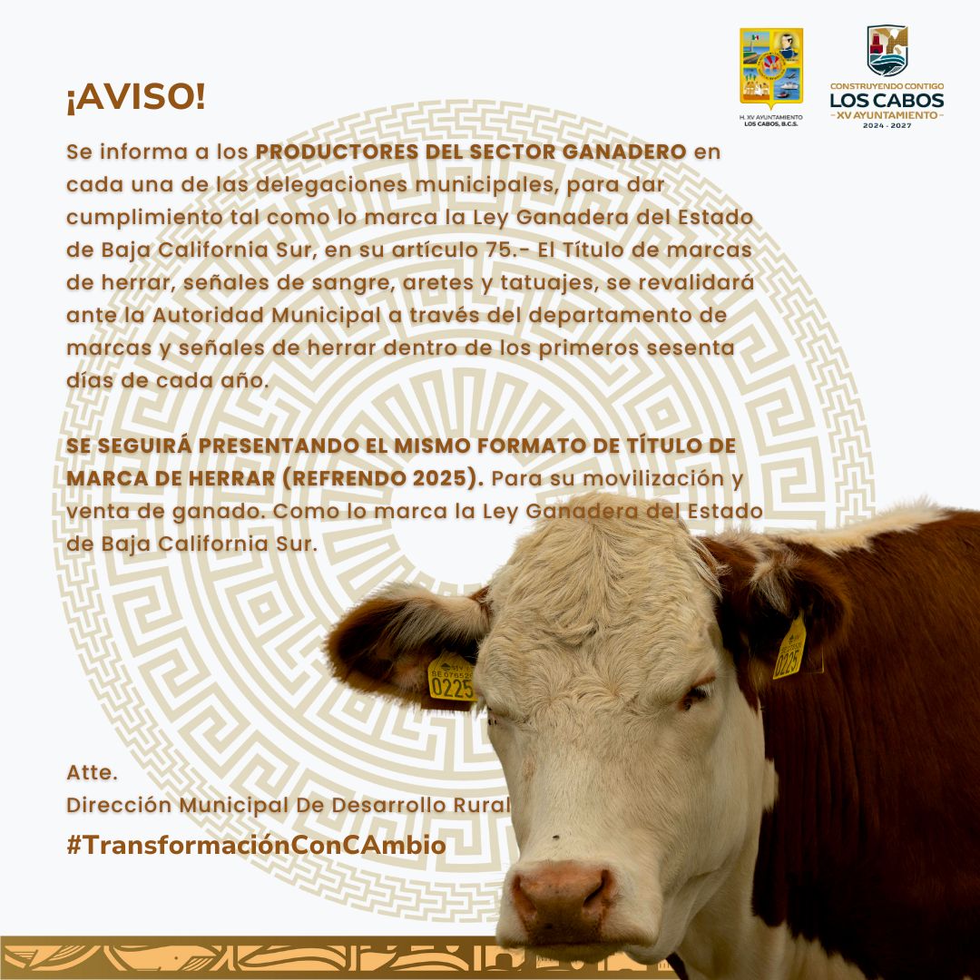 Los Cabos, Baja California Sur.– El XV Ayuntamiento de Los Cabos, a través de la Dirección General de Desarrollo Social, informa a las y los productores del sector ganadero de las distintas delegaciones municipales que es obligatorio realizar la revalidación del Título de Marcas de Herrar, señales de sangre, aretes y tatuajes, conforme a lo establecido en el artículo 75 de la Ley Ganadera del Estado de Baja California Sur.