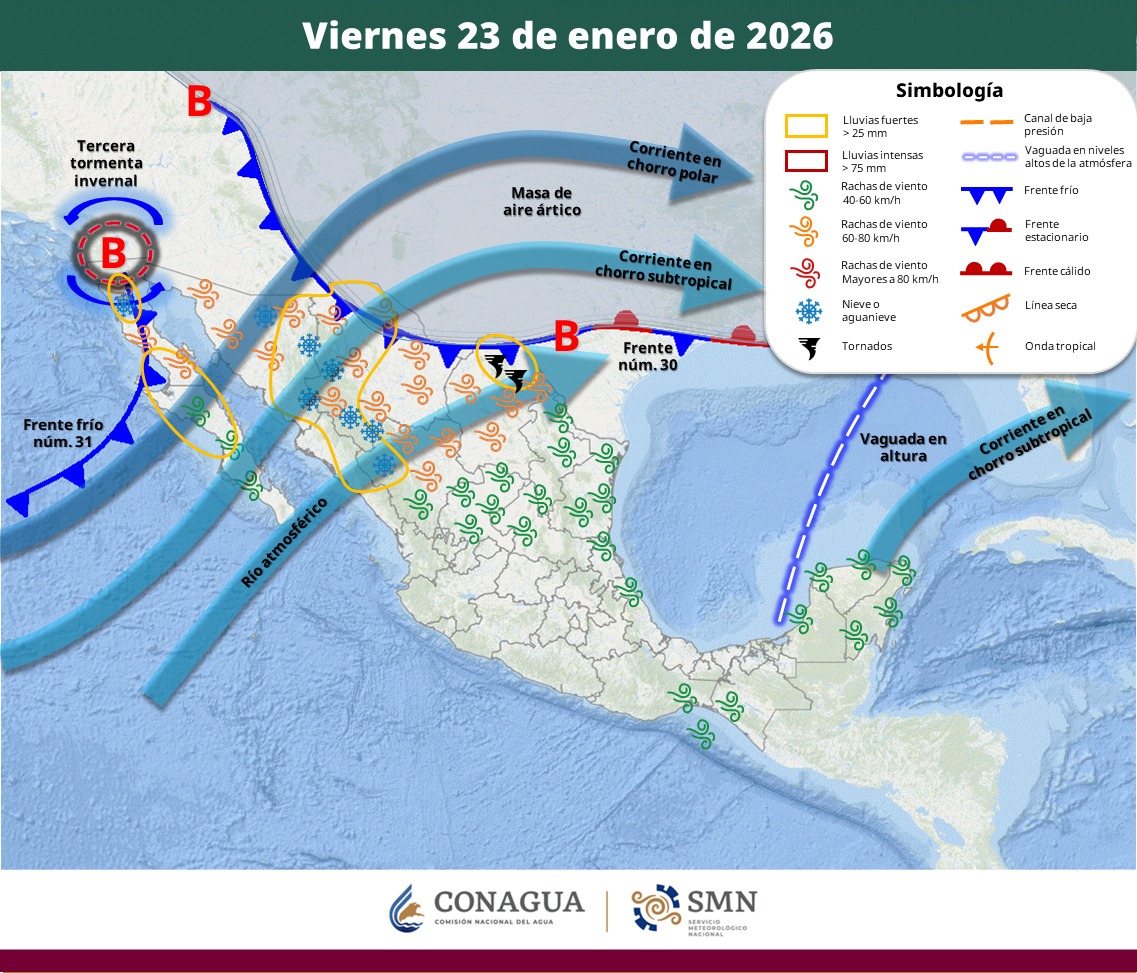 Detalló, que lo anterior será originado por la presencia de una ciculación ciclónica que estará interactuando con los frentes fríos 30 y 31, así como corrientes en chorro polar y subtropical, lo cual dará origen a la tercera Tormenta Invernal de la temporada.