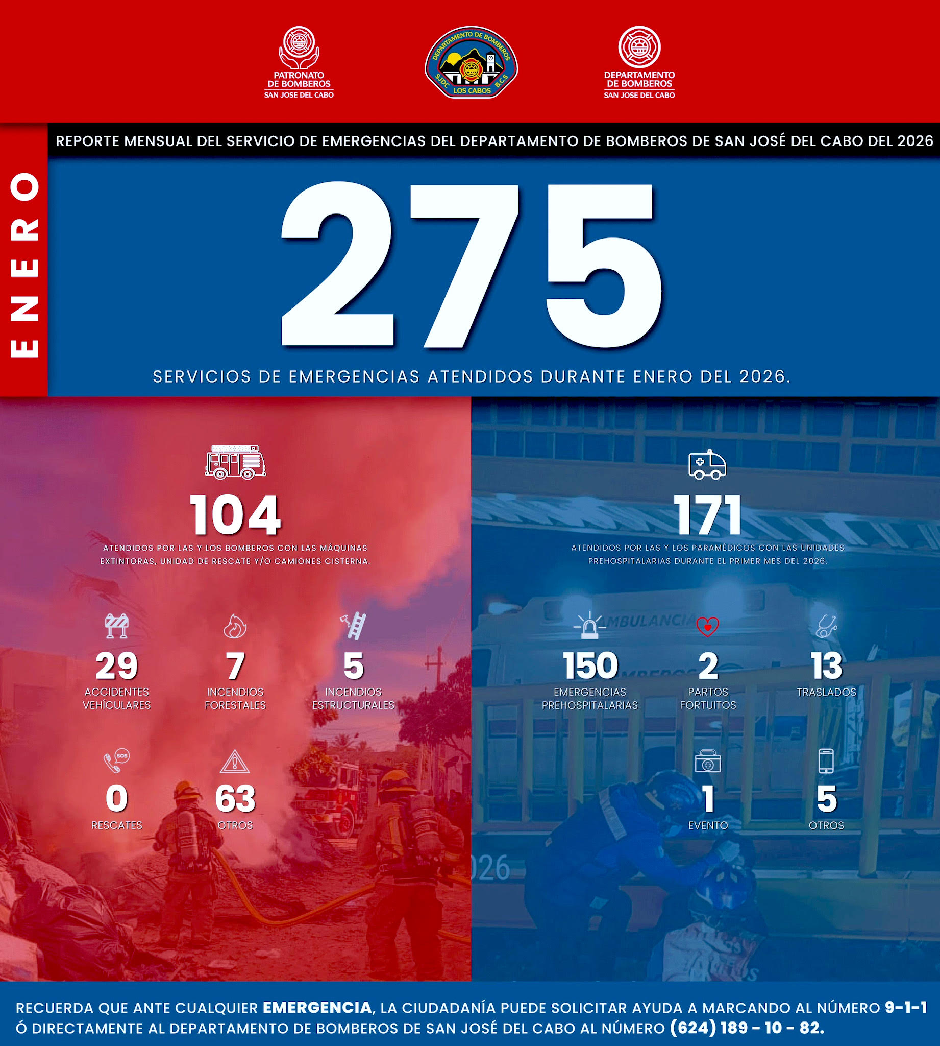Los Cabos, Baja California Sur.– Durante enero de 2026, el Departamento de Bomberos de San José del Cabo atendió un total de 275 servicios en la cabecera municipal y zona norte del municipio, de los cuales 171 correspondieron al área prehospitalaria y 104 al área bomberil, informó el comandante de la corporación, Omar Barreras Núñez.