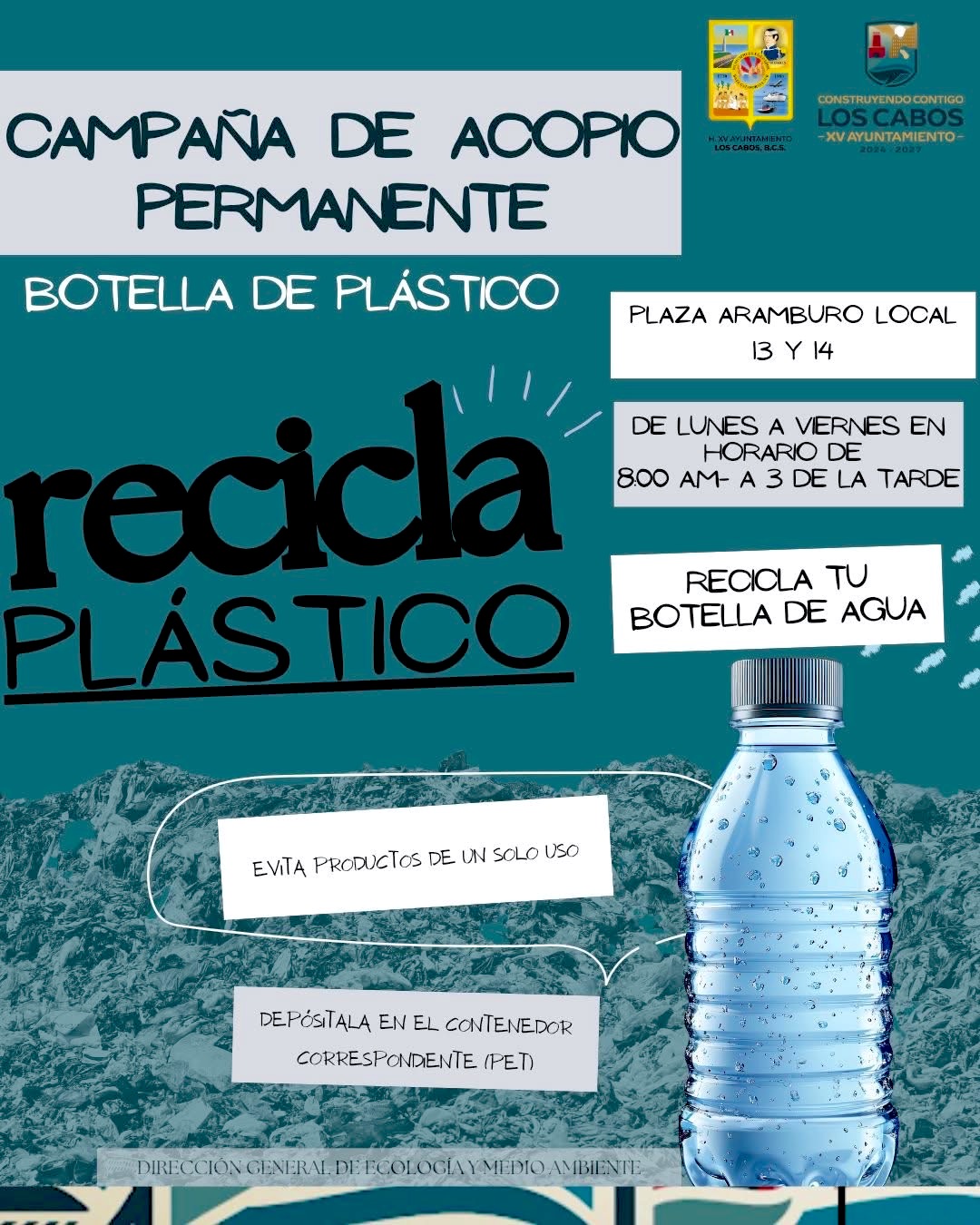 Como parte de esta estrategia ambiental, se habilitó un centro de acopio permanente ubicado en los locales 13 y 14 de Plaza Arámburo, en San José del Cabo, el cual opera de lunes a viernes en un horario de 08:00 a 15:00 horas, donde la ciudadanía puede depositar sus botellas de PET para su posterior reciclaje.