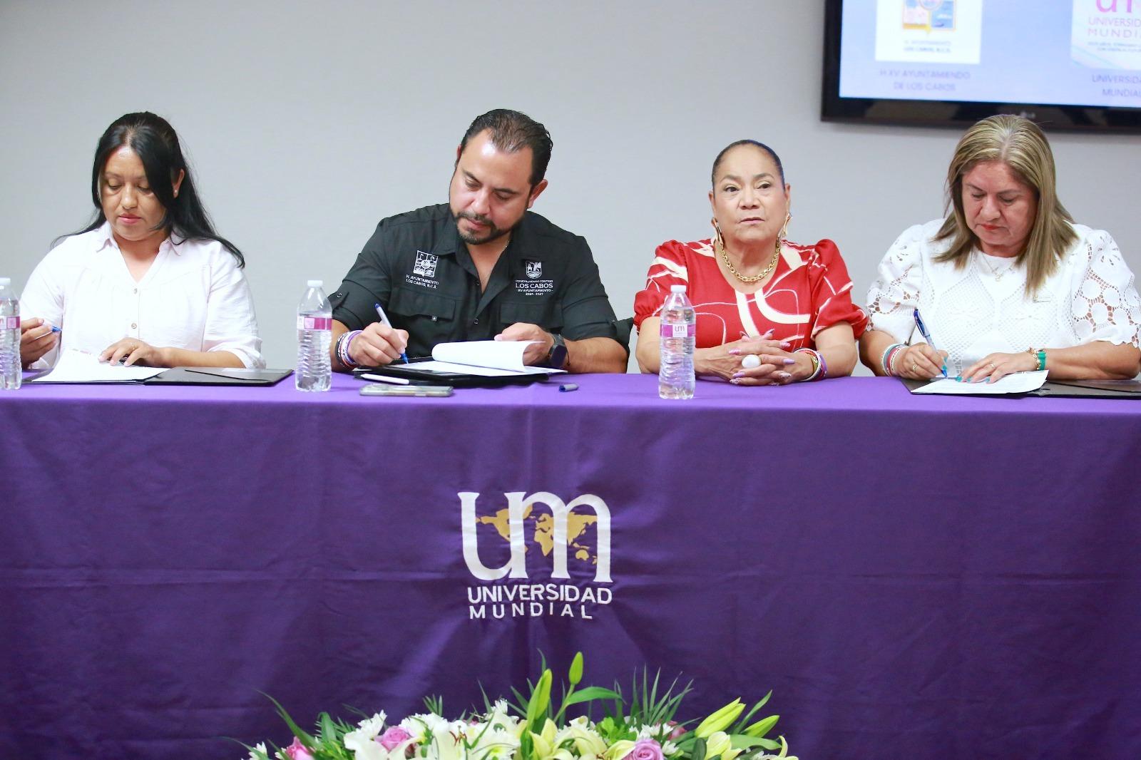 Los Cabos, Baja California Sur.– El presidente municipal de Los Cabos, Christian Agúndez Gómez y la directora de la Universidad Mundial campus San José del Cabo, Consuelo Ortuño Aguirre, encabezaron la firma de un convenio de colaboración con el objetivo de fortalecer la formación académica y vincular a estudiantes con el sector público.