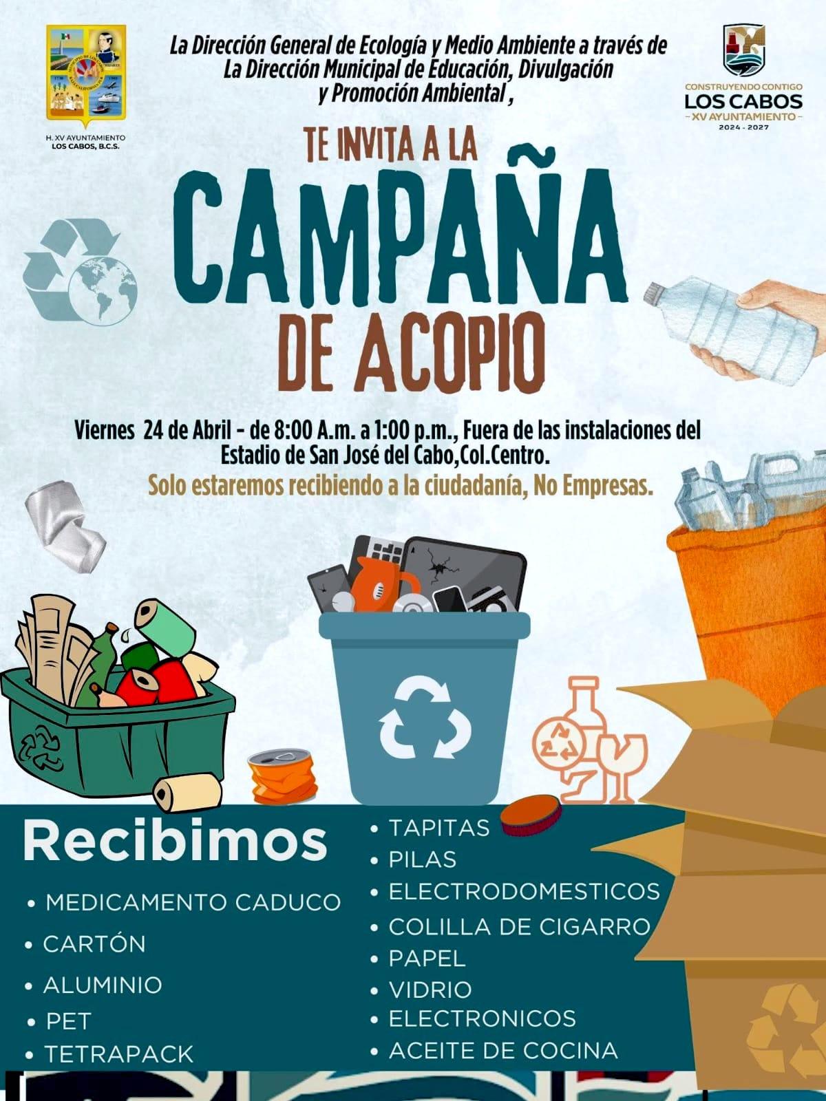 Los Cabos, Baja California Sur.– El XV Ayuntamiento de Los Cabos, a través de la Dirección General de Ecología y Medio Ambiente, invita a la ciudadanía a participar en la campaña de acopio de materiales reciclables que se realizará el próximo 24 de abril en San José del Cabo.