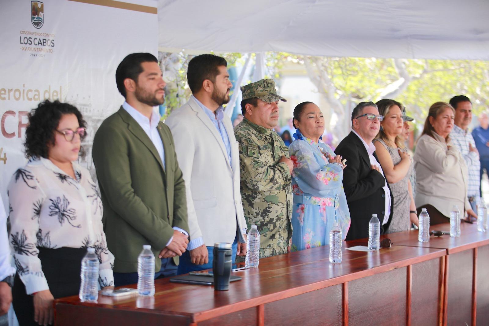 Los Cabos, Baja California Sur.– En la explanada del palacio municipal, en San José del Cabo, autoridades del XV Ayuntamiento de Los Cabos, representantes de las fuerzas armadas, estudiantes y personas servidoras públicas conmemoraron este lunes 20 de abril el 112º Aniversario de la Gesta Heroica de la Defensa del Puerto de Veracruz.