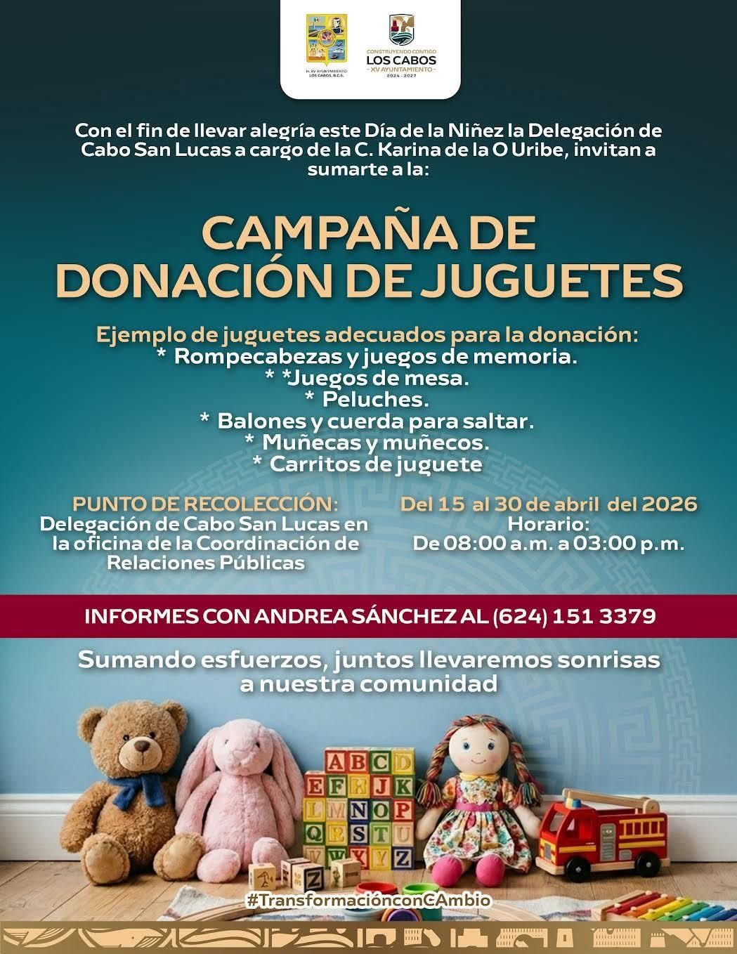 Los Cabos, Baja California Sur.– El XV Ayuntamiento de Los Cabos, a través de la Delegación de Cabo San Lucas y en coordinación con el área de Relaciones Públicas, invita a la ciudadanía a participar en la Campaña de Donación de Juguetes en el marco de la celebración del Día de la Niñez.